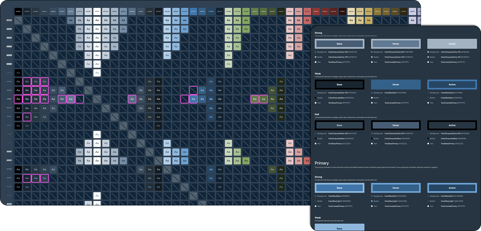 The original color palette used was not well designed for accessibility. To make sure the new design would be in alignment with standards, I performed contrast tests to ensure every color combination used would be within WCAG AAA standards. To do this, I created a Contrast Chart which compared every color in the design system to each other. I used a plugin in Figma to quickly view whether or not the color pair met standards. Then I tracked in the chart which pairs were valid to use and which weren’t. Additionally, the chart tracks which color pairs are actively being used within components in the design system- this is indicated by the magenta outlines in the chart. You may notice that there are some outlier combinations that are not within WCAG AAA contrast standards- these are regularly audited to ensure that the individual use case is still within general guidelines, such as using lower contrast for disabled states or large icons.