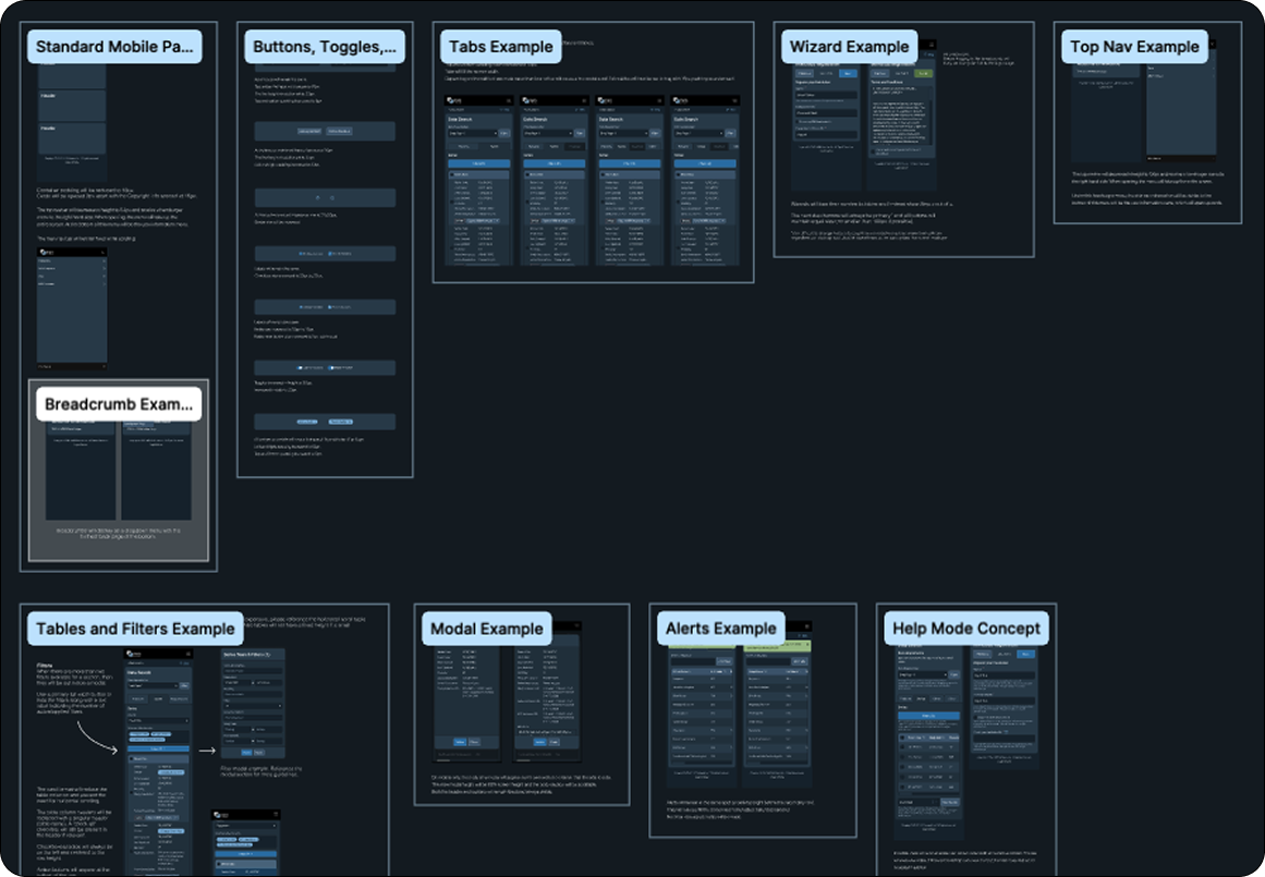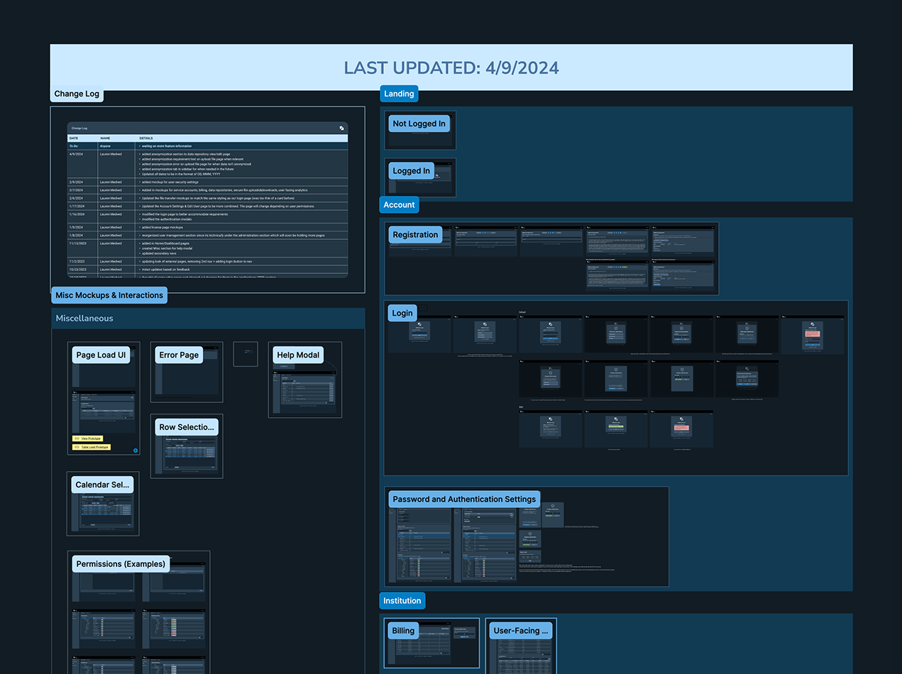 In addition to streamlining the handoff of design system styles, I set up a Master File that hosted all mockups that would be clearly labeled and maintained for engineering to reference. The process that we often followed for this product was that the engineering team would approach me with a set of pages or features that would be next in development. I would then reference how these looked in the current product and then investigate how improvements could be made with the redesign. Mockups would be created and added to the Master File, then I would update the change log and notify engineering when they were ready.
