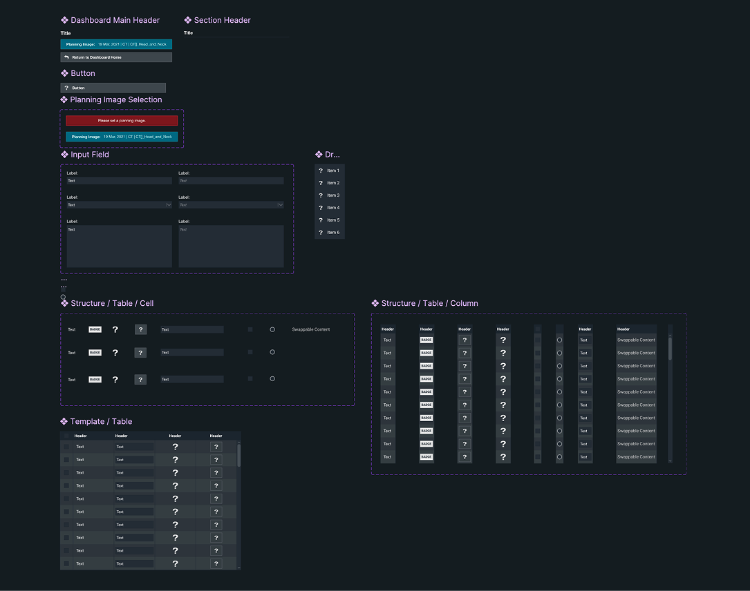Once we had the minimum updates settled for the MIM Workflow Improvements, it was time to design the base of what would become the Elekta ONE MIM Workflow Dashboards! During this process I had the opportunity to collaborate with Elekta designers to learn about their design systems and brand guidelines. I worked with MIM's engineers to create a reskin of MIM for the partnership and then applied the new styles and colors to our Workflow sidebars. This set the foundation for our product, and I converted these styles into a mini design system. Below is an example of what these styles looked like.
