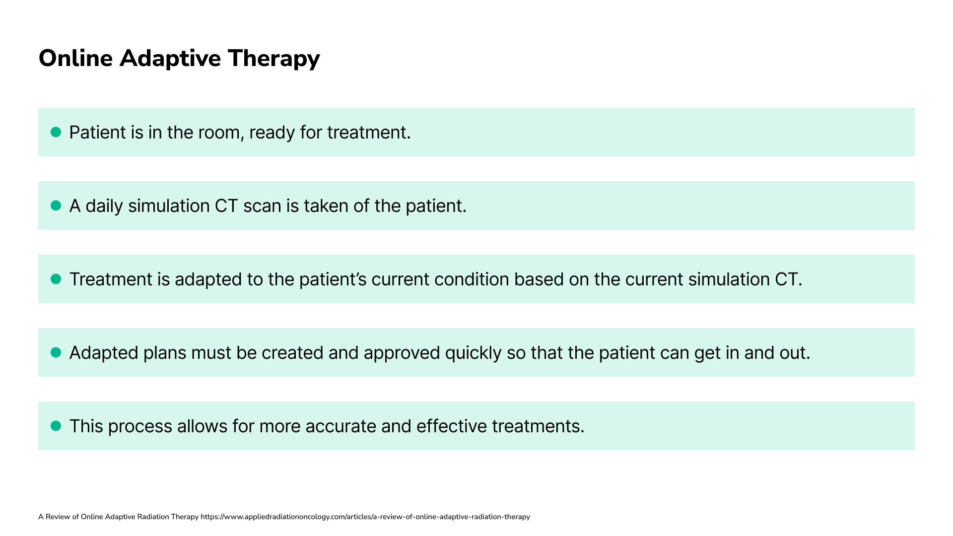 Now before going into further detail, it's important to understand what Online Adaptive Therapy means. This is a type of radiotherapy treatment that allows for more accurate and rapid treatment. In step 4, the patient usually has treatment administered in standard rounds and will have a follow up every few months. The treatment is not getting adjusted during this time. While for most cases this is fine, it can lead to inaccuracies over time. For example, if the patient gains or loses weight, organs and tumors may shift which could require a new treatment plan. Additionally, if treatment is highly effective or not as effective as predicted, it could lead to incorrect predictions on the size and location of the tumor. Online Adaptive Therapy solves this problem by adapting the treatment plan while the patient is in the room, on the table, with adjustments occuring in the few moments before the treatment is delivered. This is why the process must be quick, so as to not make the patient wait too long. It also allows for the treatment to be more accurate because a new image is taken of the patient and the treatment plan is adjusted for their current condition each day.