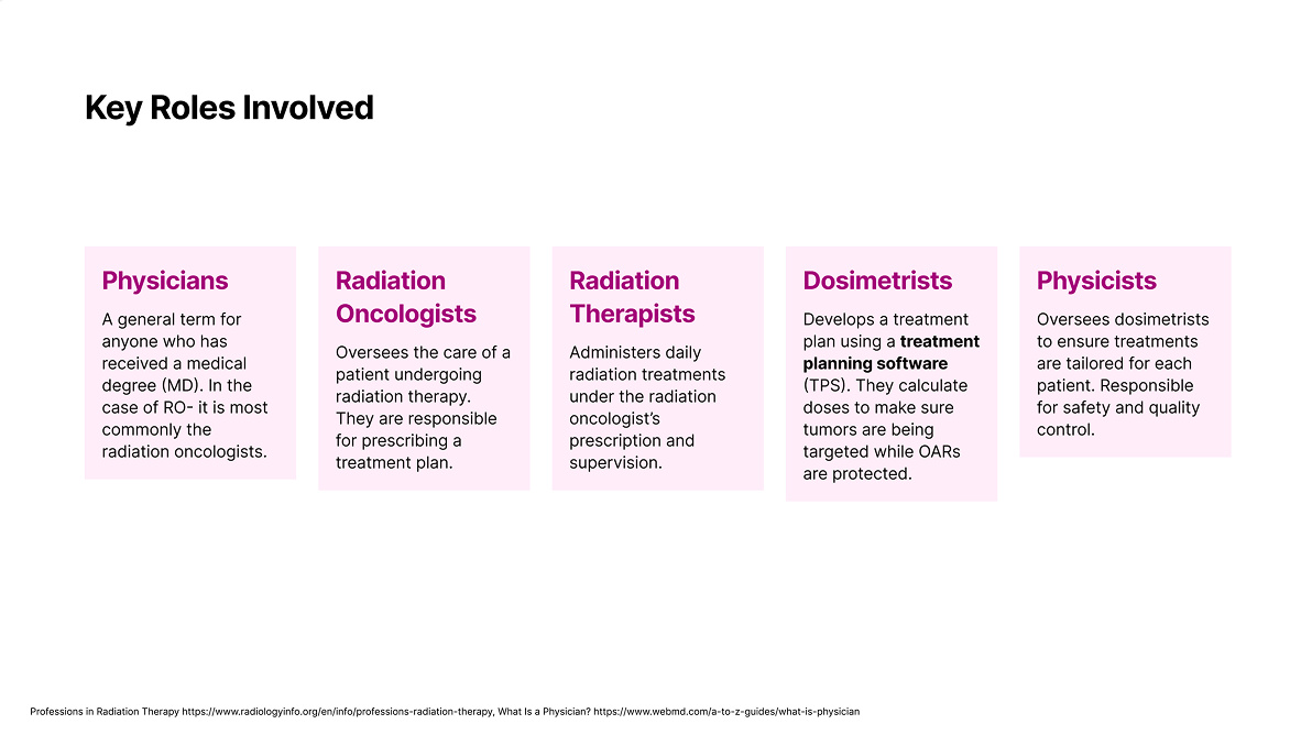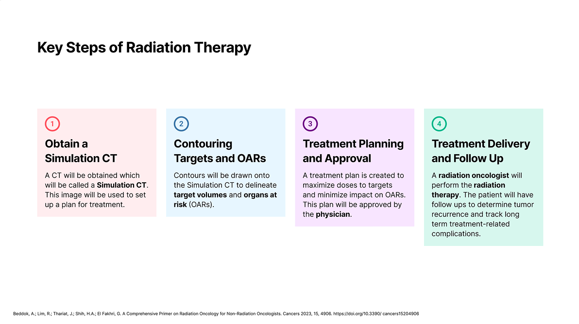 As a whole, radiation oncology can be broken down into 4 steps. First, a patient will get a CT scan that will be used to create a treatment plan. Before the plan is made, a physician will draw contours on the image to delineate tumor target volumes and organs at risk (OARs). These are the parts of the body that physicians either want to target or avoid during treatment. MIM is a common product used during this process, providing the tools needed to view, manipulate, and draw on images. Next, treatment planning begins. Dosimetrists typically create a plan for doses to administer during treatment, this plan then get approved by the physician. Once the plan is approved, the patient can undergo treatment. This is a cyclical process that involves delivering radiation to the patient and then having follow ups to check in and determine effectiveness of the treatment.
